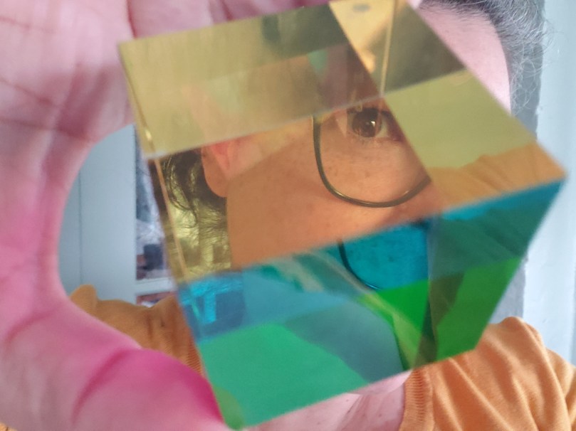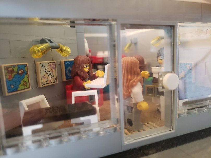 A glimpse into a LEGO coffee shop, through the transparent door and windows of the facade. Inside, a minifig with long brown hair, bangs, and glasses sits on a red armchair and holds an open laptop. Two customers, one sitting and one sanding, chat to one another. A red cappuccino maker is visible in the background. The walls are decorated with maps in different styles.Andreae looks at the camera through a CMY cube, which she is holding in front of her face.