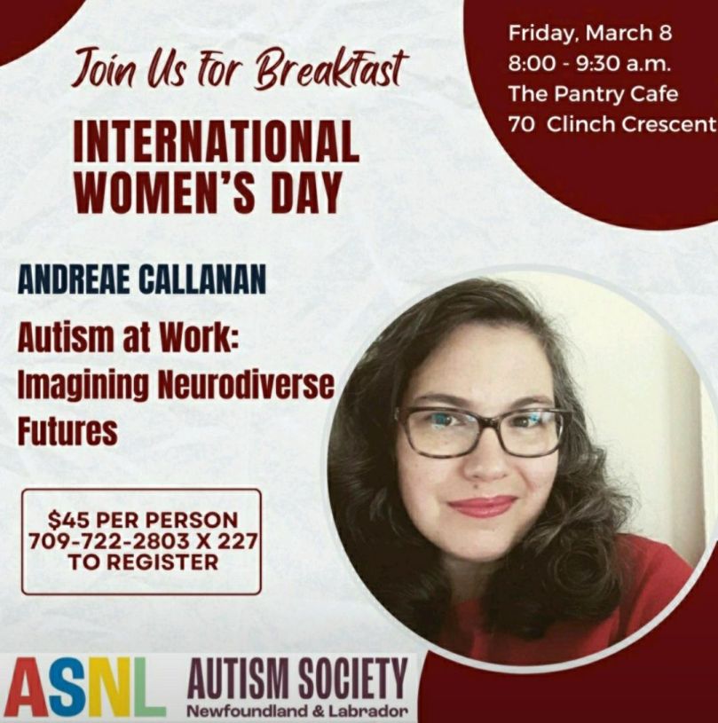 This talk was originally written for the Autism Society of Newfoundland and Labrador‘s International Women’s Day breakfast, which had been scheduled for March 8th; a snowstorm meant that ASNL had to reschedule the event for March 20th.