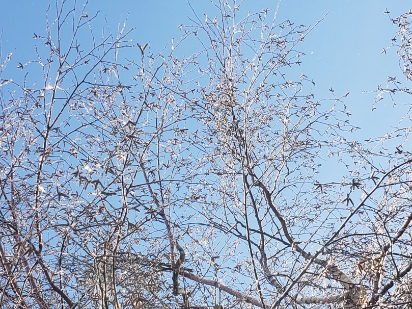 • Glittery, ice-covered, leafless birch branches against a pale blue winter sky.