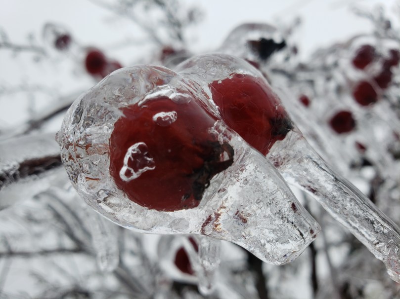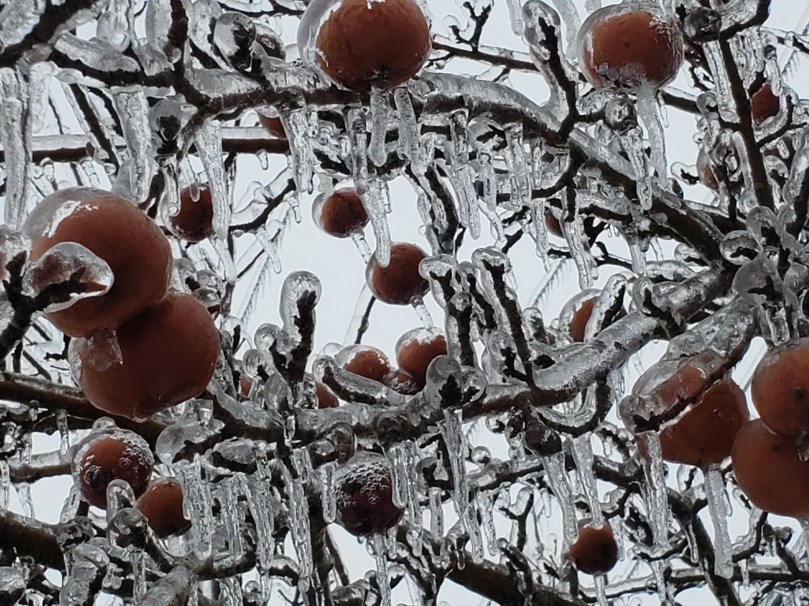 A close-up of two small crabapples from an ornamental bush, encased in ice. The drips, instead of going straight down, are frozen at an angle, indicating how intense the wind was during the storm.