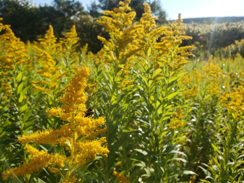 A stand of goldenrod lit by low morning sunlight. Two bumblebees are busily collecting pollen on one of the flowers.