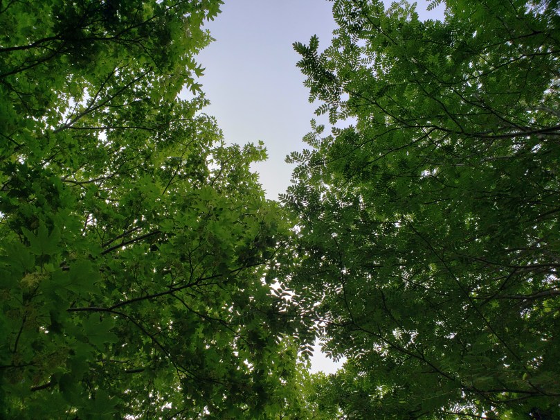• The crowns of two lush, green trees — a maple on the left, a dogberry on the right — meet against a watery blue early-morning sky.
