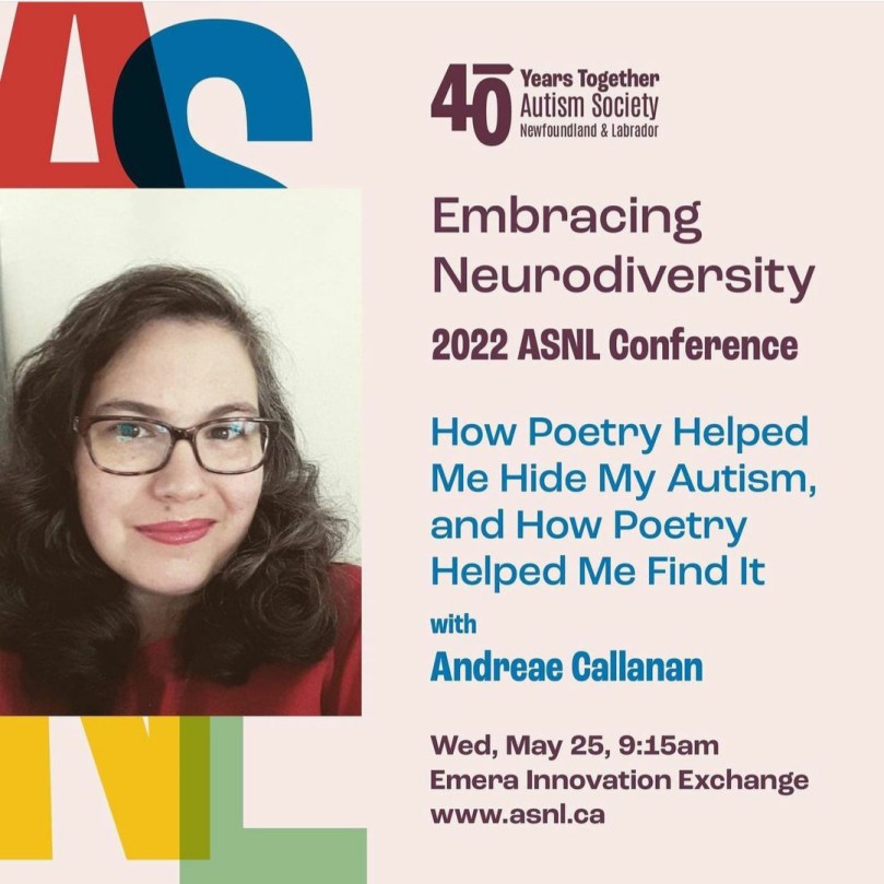 A publicity image from the Autism Society of Newfoundland and Labrador, advertising their 2022 conference. The image has a photo of me (a white woman with long salt-and-pepper hair and tortoiseshell-patterned eyeglasses), and text reading “40 years together: Autism Society Newfoundland & Labrador. Embracing Neurodiversity 2022 ASNL Conference. How Poetry Helped Me Hide My Autism, and How Poetry Helped Me Find It with Andreae Callanan. Wed, May 25, 9:15 am, Emera Innovation Exchange.”