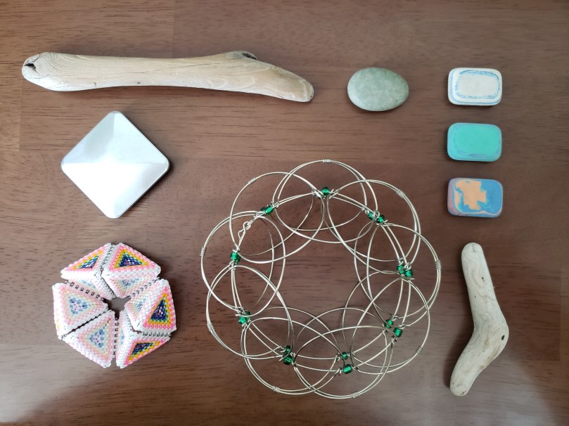 An arrangement of objects on a wooden desk. The photo is dimly lit and slightly out of focus. The objects are (clockwise from upper left): a smooth piece of driftwood about 4″ long that looks like a bone; a small, egg-shaped beach rock; three small, flat, rectangular erasers that look like stones; another piece of drift wood, this one about 3″ and bent at about a 155-degree angle; a silver-toned foldable wire mandala with emerald green beads; a rainbow beaded hexaflexagon; a square cast-aluminum fidget toy.