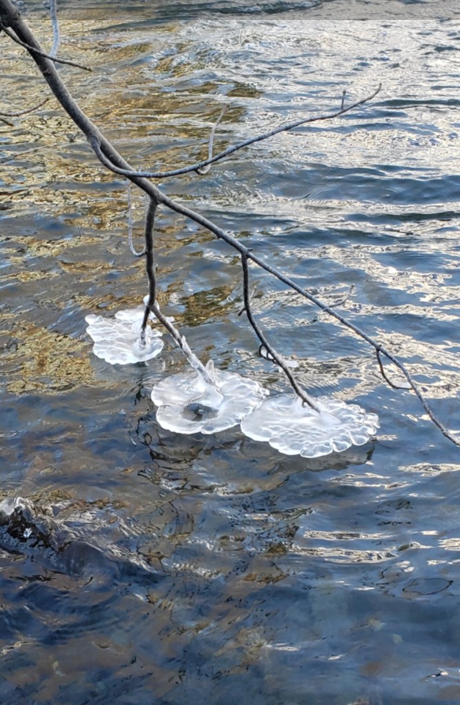 • A slender branch leans into rushing river water. Three twigs on the branch touch the water’s surface, and at each point of contact a plate-like accumulation of ice has formed. The ice plates are around four to six inches in diameter, and have slightly petalled edges. They look like kind of like jellyfish.